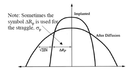 이온 주입 직후 Dopant는 Gaussian profile을 따르며, 중심은 Rp, 분산은 △Rp를 가지지만, 열처리를 하게 되면, 도펀트가 추가적으로 확산되며 농도 profile이 퍼지고 junction depth가 깊어지는 (+ tail이 발생하고 peak이 낮아지는) 부작용이 발생한다.