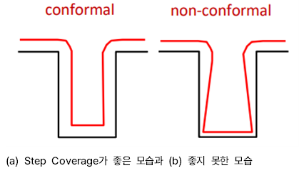 좋은 step coverage는 수평면과 수직면의 두께가 거의 동일하게 증착되어 전기적 연결이 잘 되지만, 나쁜 step coverage를 가질 경우 수평면과 수직면의 증착이 잘 되지 않아 공백이 생긴다.