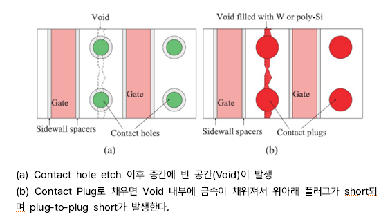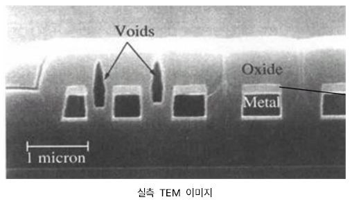 금속 라인(Metal Line) 사이에 산화막을 CVD로 증착 중 aspect ratio가 큰 영역에서 void 형성된다. 이런 void는 이후에 전기적 연결 장애(Short) 또는 신뢰성 저하로 이어진다.