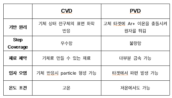 CVD는 '기체 상태'의 전구체의 표면 화학 반응이 기반 원리인 반면 PVD는 고체 타겟에 이온을 충돌시키는 방식 (sputtering)이 main mechanism이다. CVD는 step coverage가 우수하고 고온에서 가능하며, 기체 상태여야 가능하다는 특징이 있다