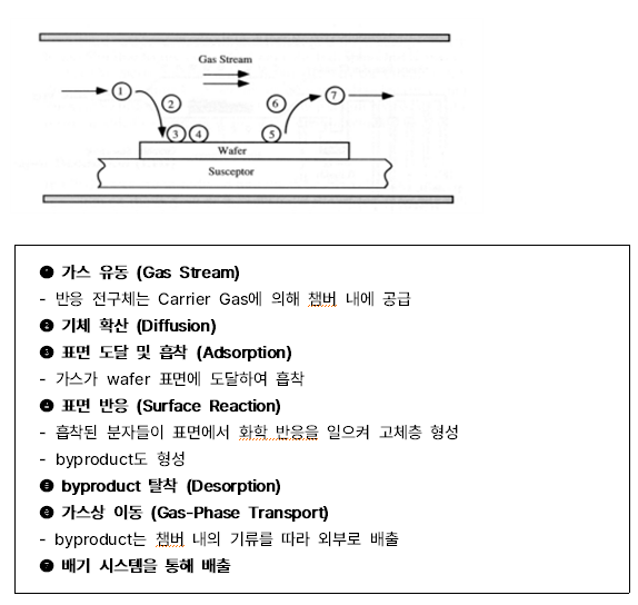 : 기체 상태의 반응물(gas precursor)이 Wafer 표면에 도달하여 화학반응을 통해 고체 물질을 형성하는 증착 방식이다.