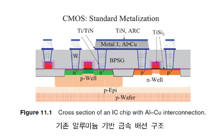 | Al–Cu 배선층 | 전자 이동 내구성(Electromigration)에 강함 PVD로 증착 |