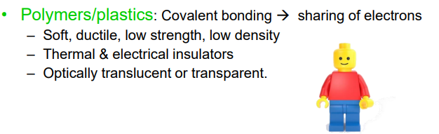 분자간 결합 특징으로 인해 soft하고 ductile(때리면 변형)하고, low strength/density 등의 특징이 생긴다. chain 과 chain 사이를 끊을 수 있기 때문이다. 공유결합은 자유 전자가 없어 열/전기적 이동도가 낮다. 광학적으로는 밴드갭이 넓어 투명하다.