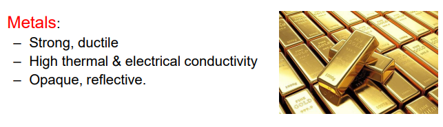 Metal은 배위 전자가 많아 특정한 기계적 성질이 생기고 자유전자의 수가 많아 전기가 잘 통한다. 전기가 통하면서 열 에너지도 함께 이동하기 때문에 열 전도도가 높다. 또한, Opaque (불투명)하고, 반사도가 높다.