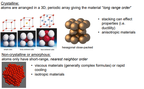 원자 배열의 규칙성이 넓은 범위에서 있으면 결정질, 없으면 비정질이라고 한다. 이전에 말한 충진이 규칙적이냐에 따라 결정되는 것이다.