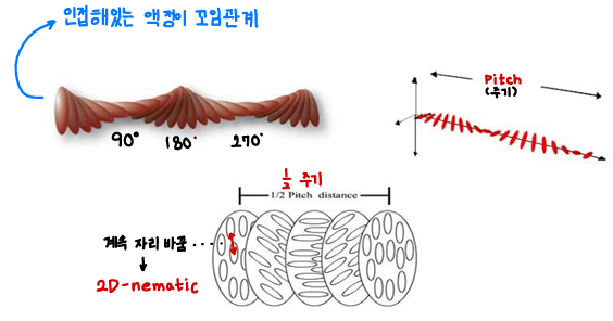 : Nematic LC가 층마다 director 방향이 조금씩 회전하면서 나선 구조를 형성한 형태