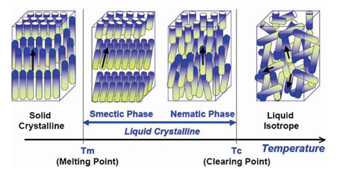 온도에 따라 LC는 3 가지 상태로 변한다. 액정상태에서는 광학적 이방성(Anisotropy) 이 존재하기 때문에, 편광판을 통해 빛의 편광 상태를 조절할 수 있다.