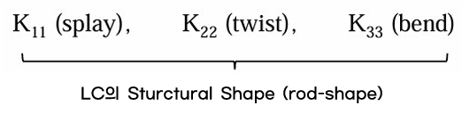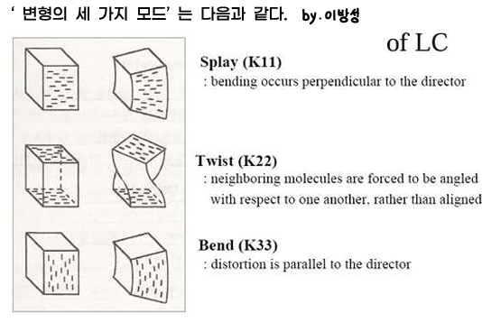 액정 분자들이 막대형으로 그 평균 방향을 director(n)이라고 부르며, 움직이는 물리적 변형이 일어날 때 어떤 부분은 퍼지고(splay), 어떤 부분은 비틀리고 (Twist), 어떤 부분은 굽어진다(bend).