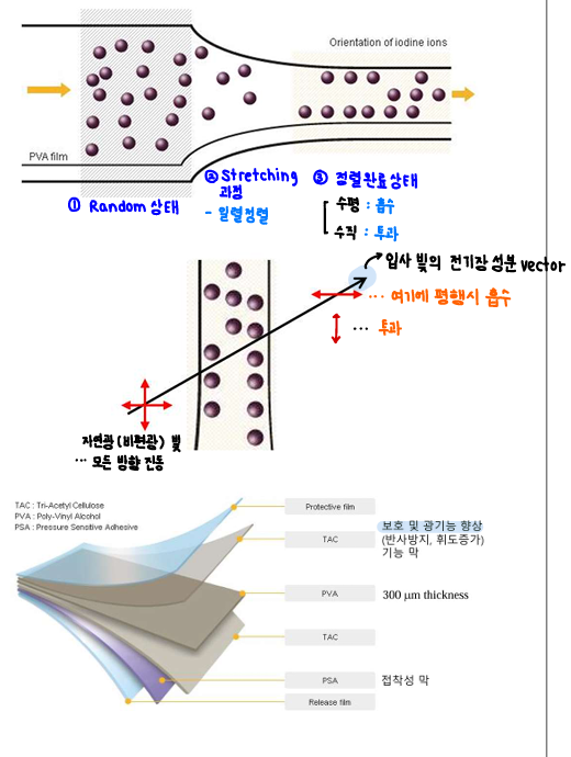 편광판의 기본재료는 PVA 필름으로 원래 원자(I)들이 random하게 분포되어있으나 Stretching(연신) 공정으로 분자를 한 방향으로 늘려 정렬시켜 전자의 진동 자유도가 특정 축으로만 남아 편광 기능이 생긴다.