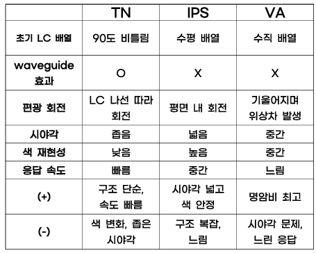 즉, 각 MODE (TN/ STN/ IPS/ VA)는 LC 분자가 어떻게 회전하고 그에따라 빛이 어떻게 변하느냐의 차이이다.