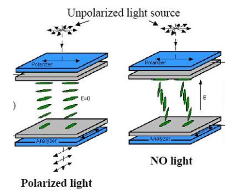 - 전압이 ON일 때 → LC 배열이 전기장 방향으로 펴짐 → 편광 회전이 사라짐 → 차단(Dark)
