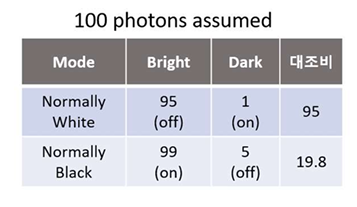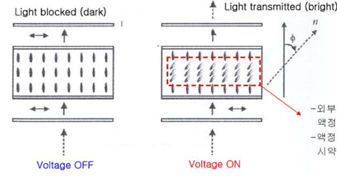 | Normally Black Mode | - 전압이 ON일 때 밝으며 상하 두 편광판의 편광 방향이 평행하다. |