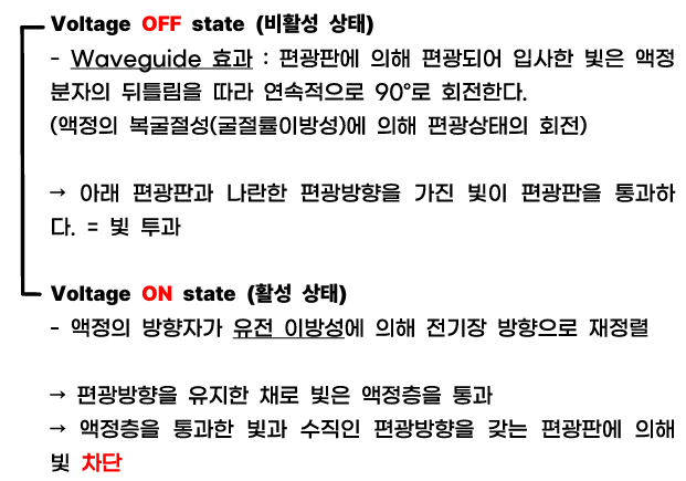 | Voltage ON | LC 기울기 | 편광 회전 O | 빛 통과 |